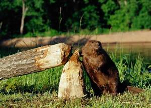 Eager beaver Jake flexing for the camera in the act of “felling trees left and right” …