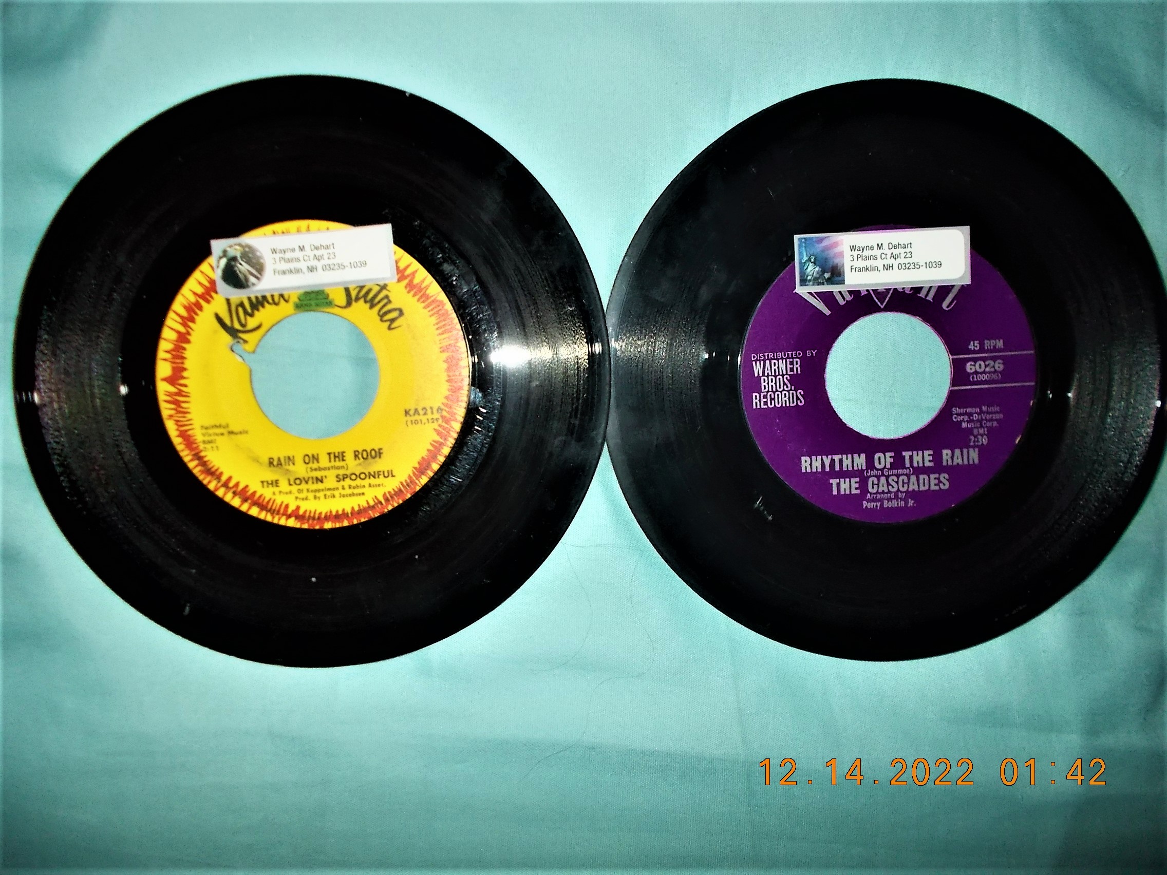 And of course I still have those original, referenced “two well-worn 45’s of mine” – only now in a different NH closet. Bought both new from Greenlaw’s Music Store in Laconia, NH. “Rain on the Roof” in 1966 and “Rhythm of the Rain” in 1963.