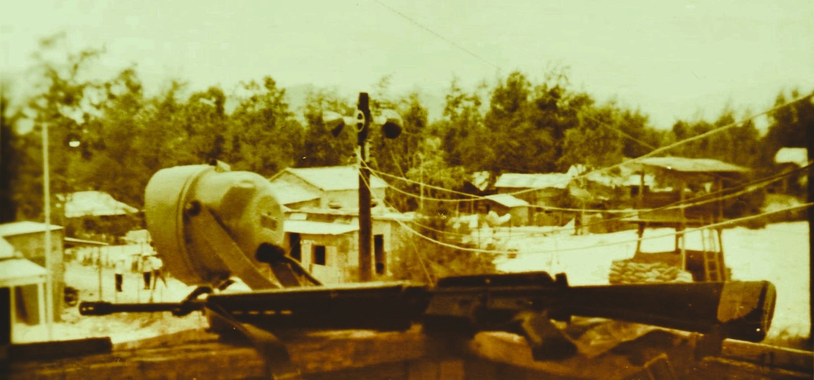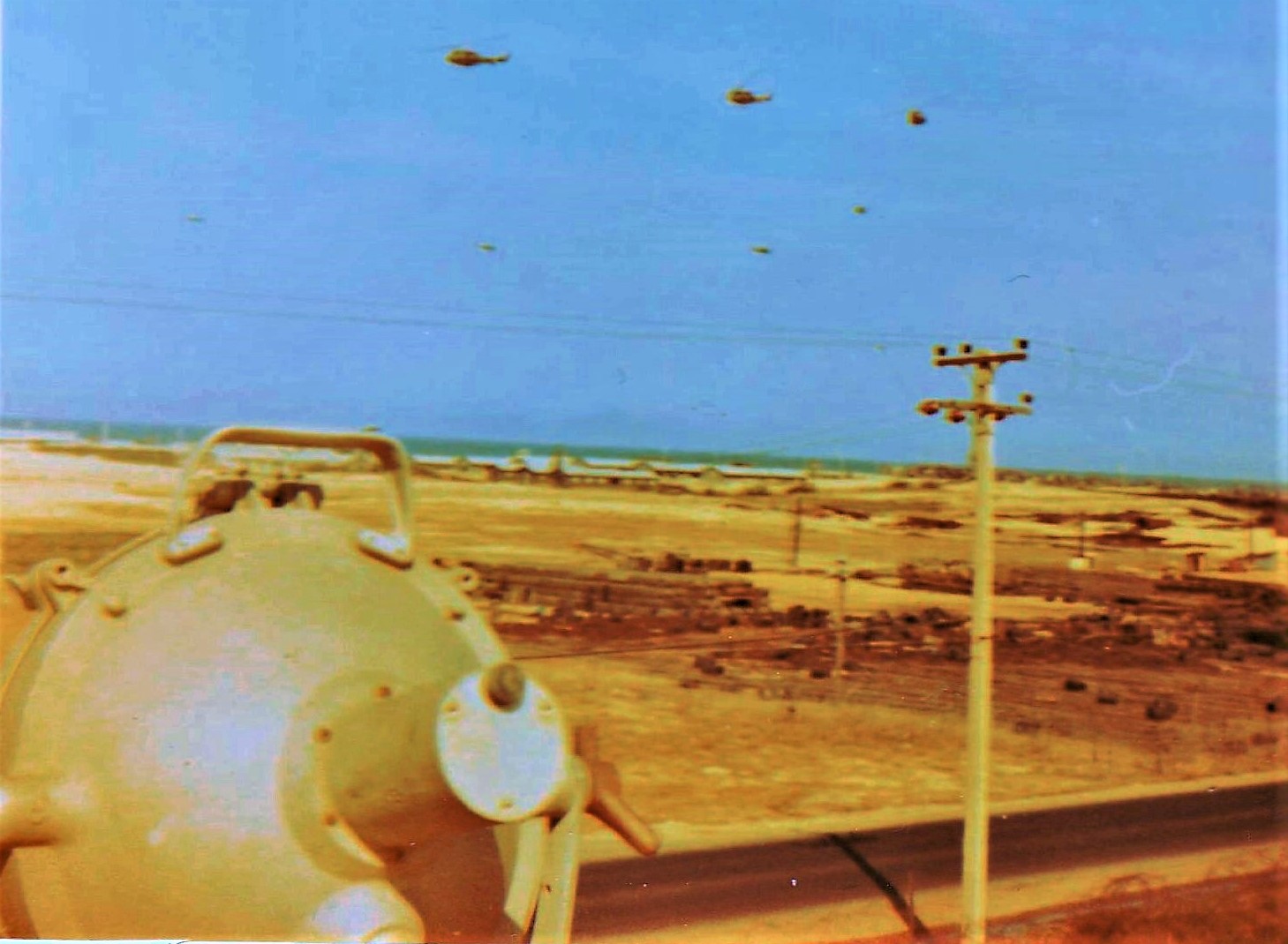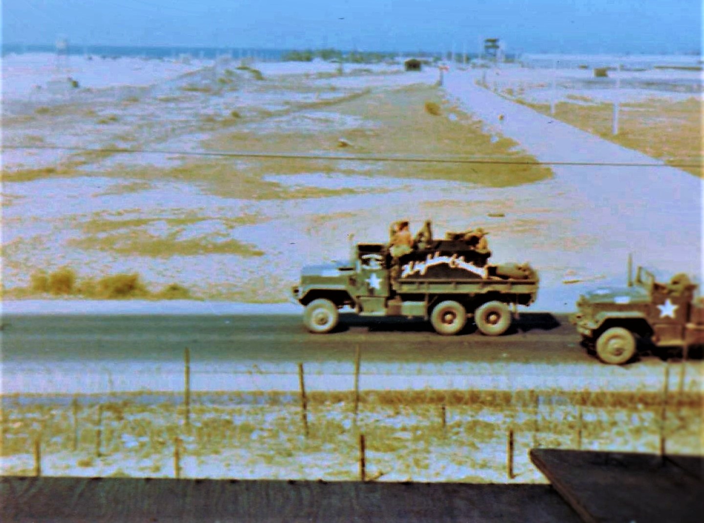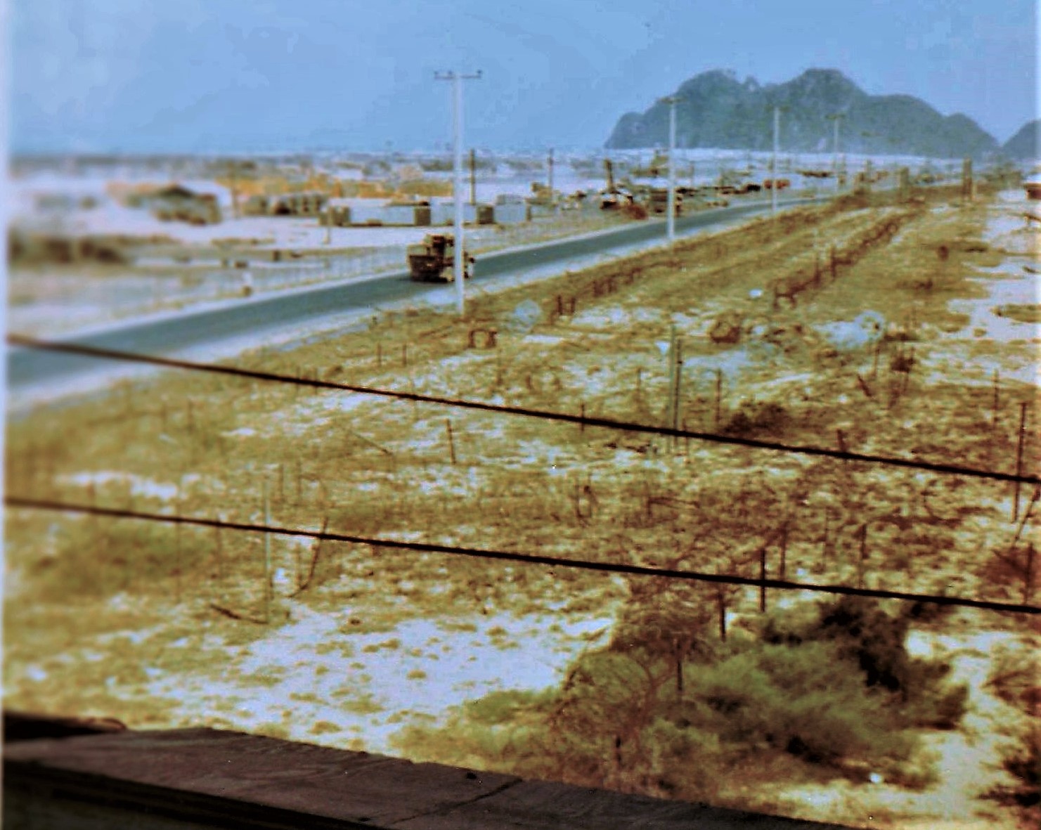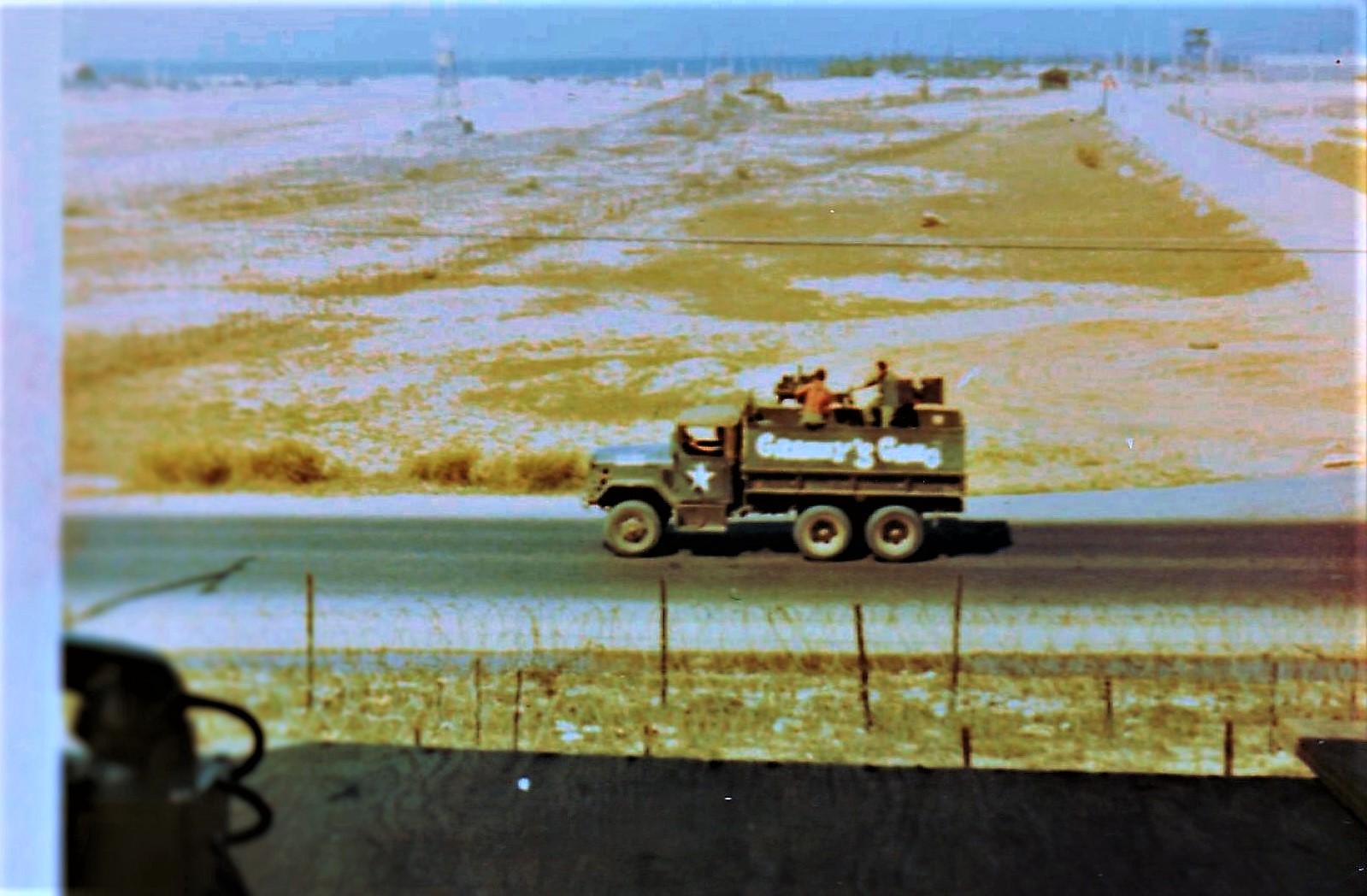 These first four photos were taken by me, using a Kodak Instamatic camera, from a Camp Baxter guard tower fronting the Marble Mountain Air Facility (then home to Marines MAG-16, supplemented by an Army helicopter company & 5th Special Forces), with the South China Sea in the background. There are actually five fabled Marble Mountains, the northernmost of them standing strong in the distance in the first pic, which was taken facing south along the coastal road. (Seventeen Green Berets were killed at Marble Mountain on August 23rd, 1968 – the largest loss of life in a single attack in Special Forces history.) Several choppers can be seen “forming up” above the facility in the second photo. The two bottom pics show fortified, armor-plated, 10-wheel “deuce-and-a-half” gun trucks traveling north toward DaNang.  These trucks were rigged out  –  uniquely modified and equipped, each with a catchy name emblazoned boldly on the side. They primarily protected transportation units, serving as escorts for convoys, and were not to be messed with due to the trucks’ maneuverability and formidable weaponry, matched by the aggressive, “bring it on” mentality of its crew.
