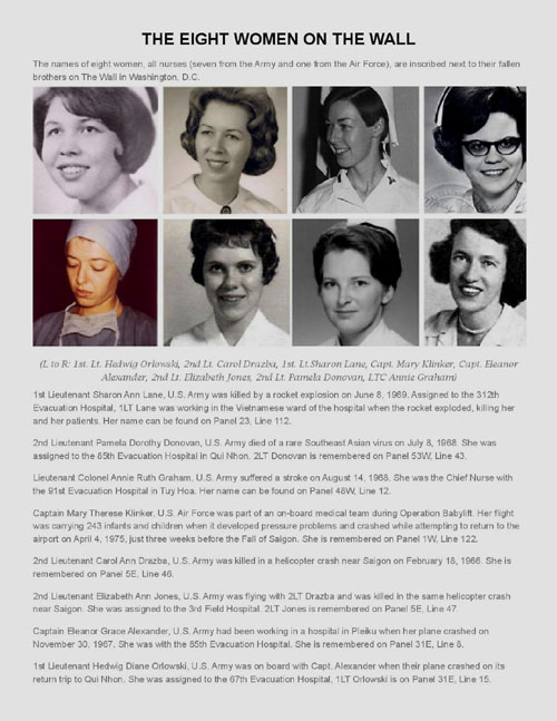 The  eight heroic women who gave their lives in Vietnam. Each of their names appear on “The Wall” in Washington. Some 11,000 women served voluntarily in RVN during the war, and needless to say, none of them were drafted. They saved lives and provided support beyond their job descriptions.